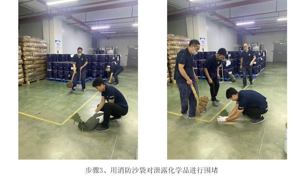 步骤3、取消防沙袋对泄露化学品进行围堵并清理