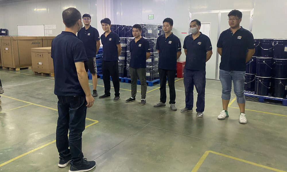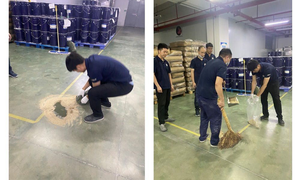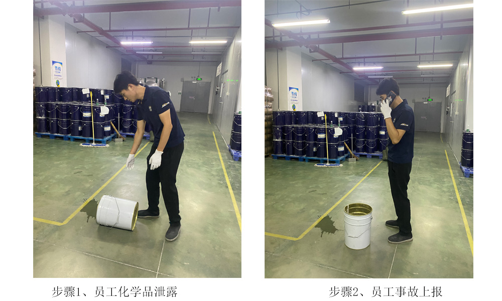 在演练之前对公司管理人员对所有员工进行环境突发事件的相关知识和要求进行了培训和讲解,本次事故应急演习主要是模拟公司员工在搬动化学品时发生倾倒泄漏事故。